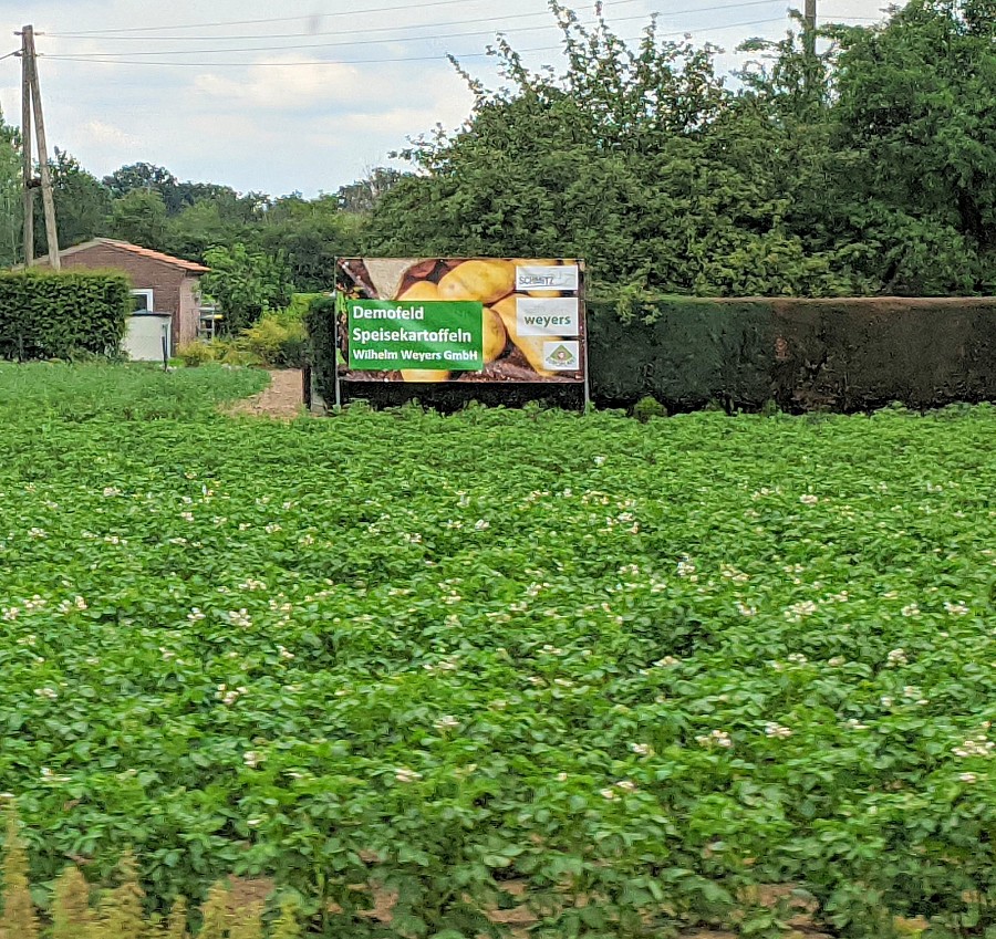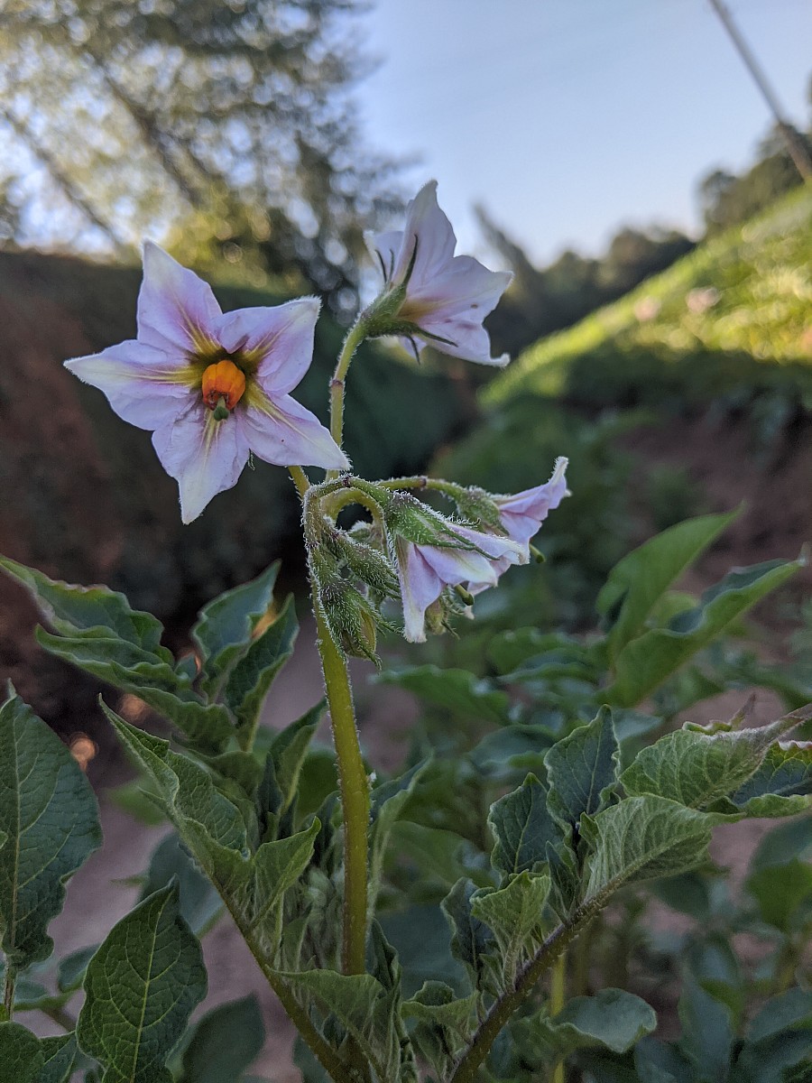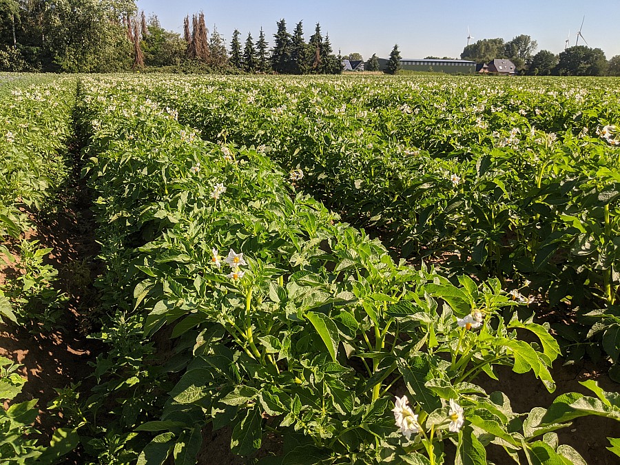 Die Blüte hat eingesetzt, je nach Sorte blühen die Kartoffelpflanzen nun violett, blau und weiß. Unter der Erdoberfläche hat die Kartoffelpflanze aufgrund der extremen Trockenheit am Niederrhein teils zur Rückbildung bzw. zum Abstoßen einiger Knollen geführt.